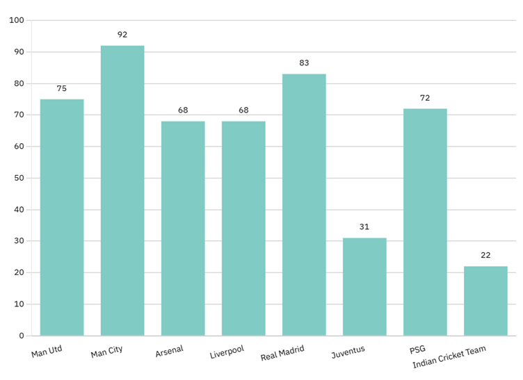 Compared to shirt sponsorships with the top European clubs, you can see the deal struck between BCCI and Apollo pales in comparison. Manchester City, PSG, Manchester United, Real Madrid – all have significantly higher deals per year with their main kit sponsor than the Indian Cricket Team. Manchester City taking the cake at 92 million dollars per year followed by Real Madrid at 83 million dollars and Manchester United at 75 million dollars. Ironically, Apollo Tyres is an additional sponsor of Manchester United.